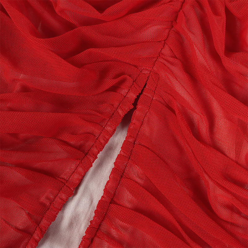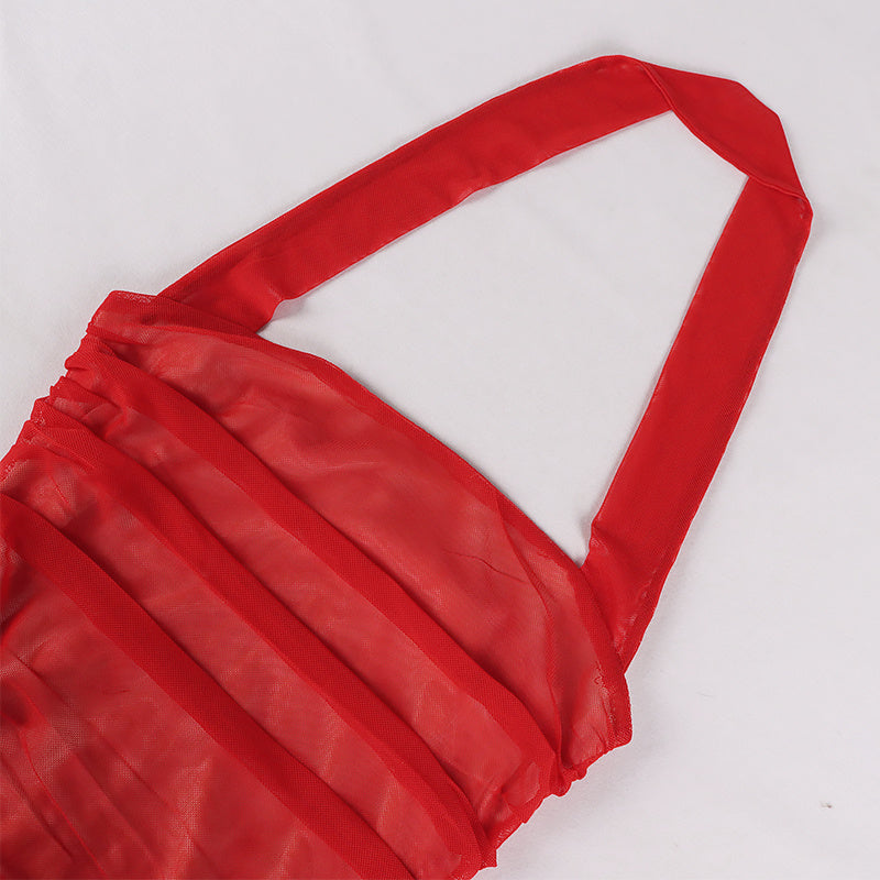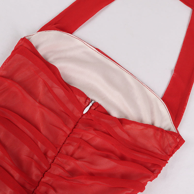 - Features: Halter Neck, Ruching, Back Slit, Back Zipper Closure